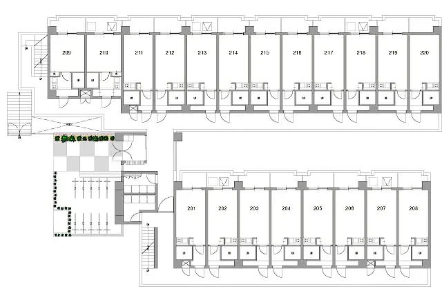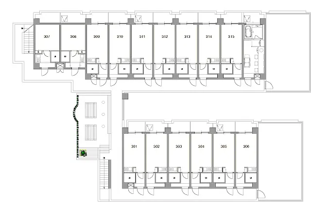 全室1Kタイプでバス・トイレ・キッチンが完備され、プライベートな生活が確保されています。共用部では住人同士の交流も楽しめる、バランスの取れた生活環境が整っています。