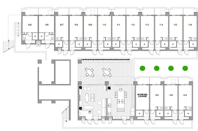 ガラス張りのラウンジは開放的で、テラスへのアクセスが可能です。テラスでは自然を感じながらリラックスでき、ラウンジ内のワーキングスペースも仕事や勉強に最適です。
