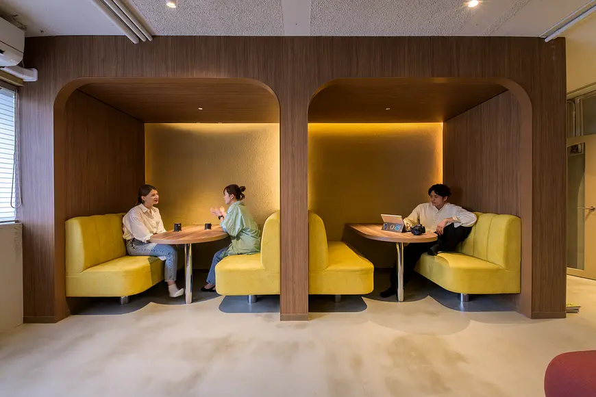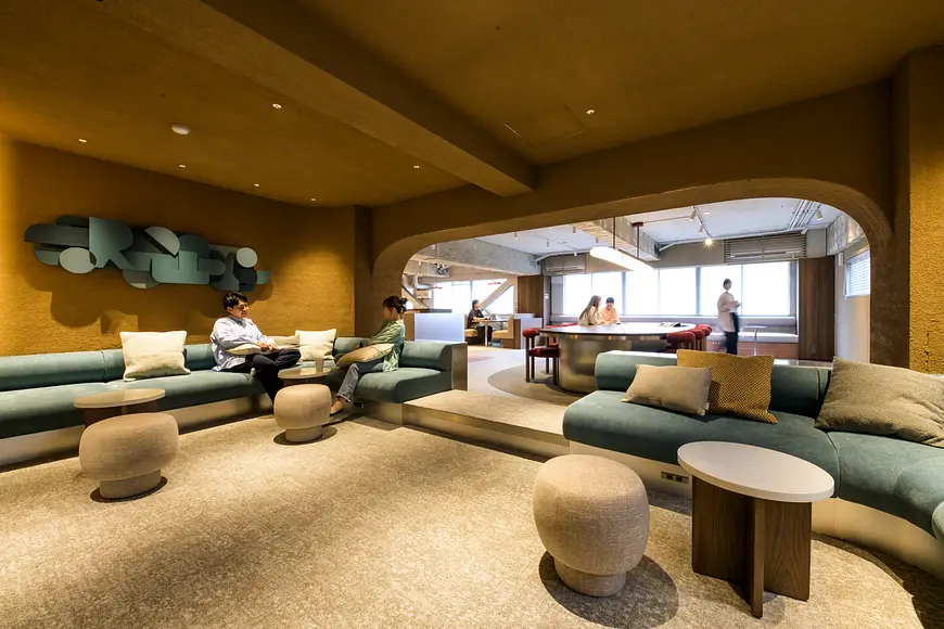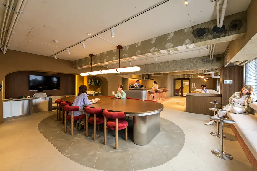 共用部は、仕事もプライベードも充実な日々が送れる様々な空間を24時間無料で利用可能。メインのラウンジは、最新家電が揃ったキッチンで料理を楽しむこともでき、入居者同士の交流の中心となる空間です。10人以上が集まれるソファスペースには、大型テレビを設置。映画鑑賞はもちろん、最新ゲームで遊ぶことも出来ます。