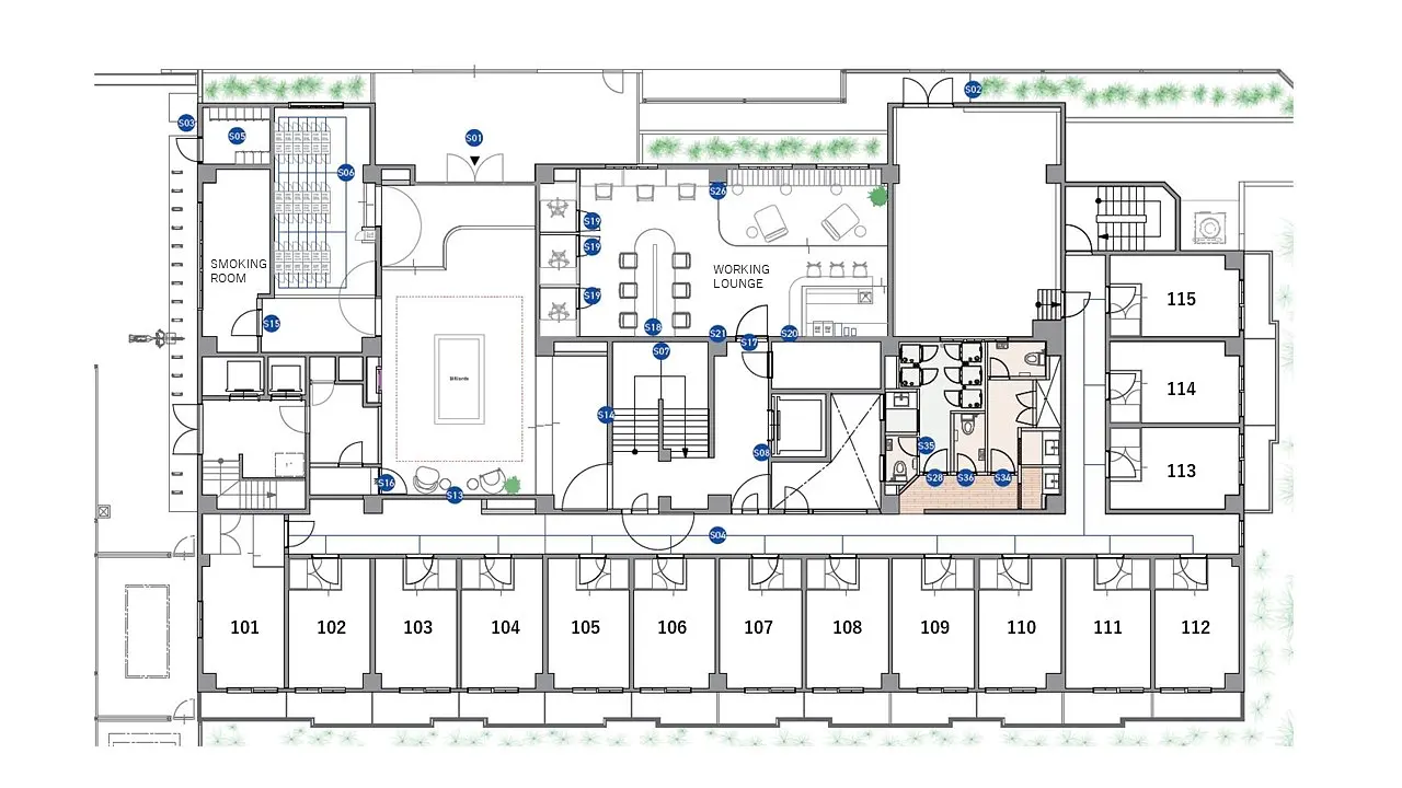 施設内の共用スペースは、広々とした「LOUNGE」と「WORKING LOUNGE」があり、用途に応じて使い分けが可能です。約150㎡のラウンジは、ダイニングスペースとリラックス空間に分かれており、住民同士が交流したり、リラックスできる場として機能します。プロジェクターで大迫力の映画やゲームを楽しむこともできます。