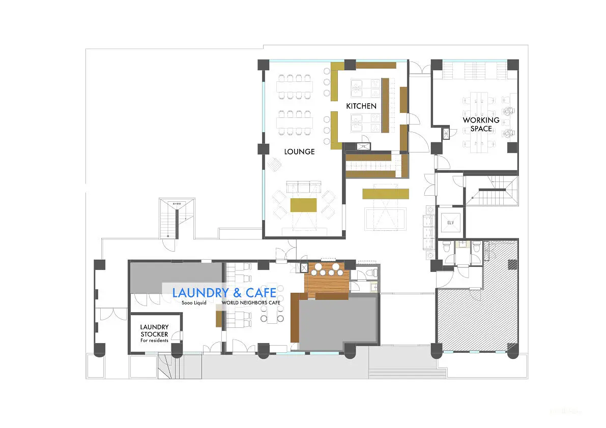 1階の大型コインランドリー「Sooo Liquid」に加え、月2回まで無料で洗濯代行も使えます。ワールドネイバーズカフェではホットサンドをメインに、コーヒーやクラフトビールも楽しめます。街に開けた空間があることで、住人はもちろん街とつながるコミュニティを楽しめます。