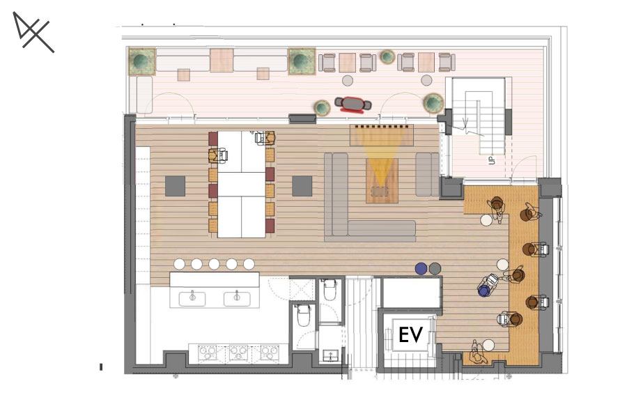 最上階に位置するラウンジは、天井が高く、東向きの窓から差し込む朝日が活力を与えてくれます。公園ビューのデスク席は日中のリモートワークに最適で、夜には100インチのスクリーンで映画やスポーツ観戦が楽しめます。