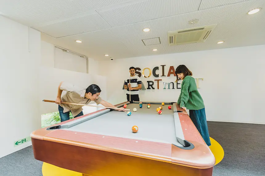 The facility features about 400㎡ of shared space, divided into three themes: ""Living,"" ""Dining,"" and ""Playing."" Stylishly designed, these spaces include remote work booths ideal for focused work, as well as a library with a projector. The facility was renovated in June 2023, adding a fitness lab, terrace, music studio, and a billiards table, offering a wide variety of options for residents to enjoy their hobbies and activities.