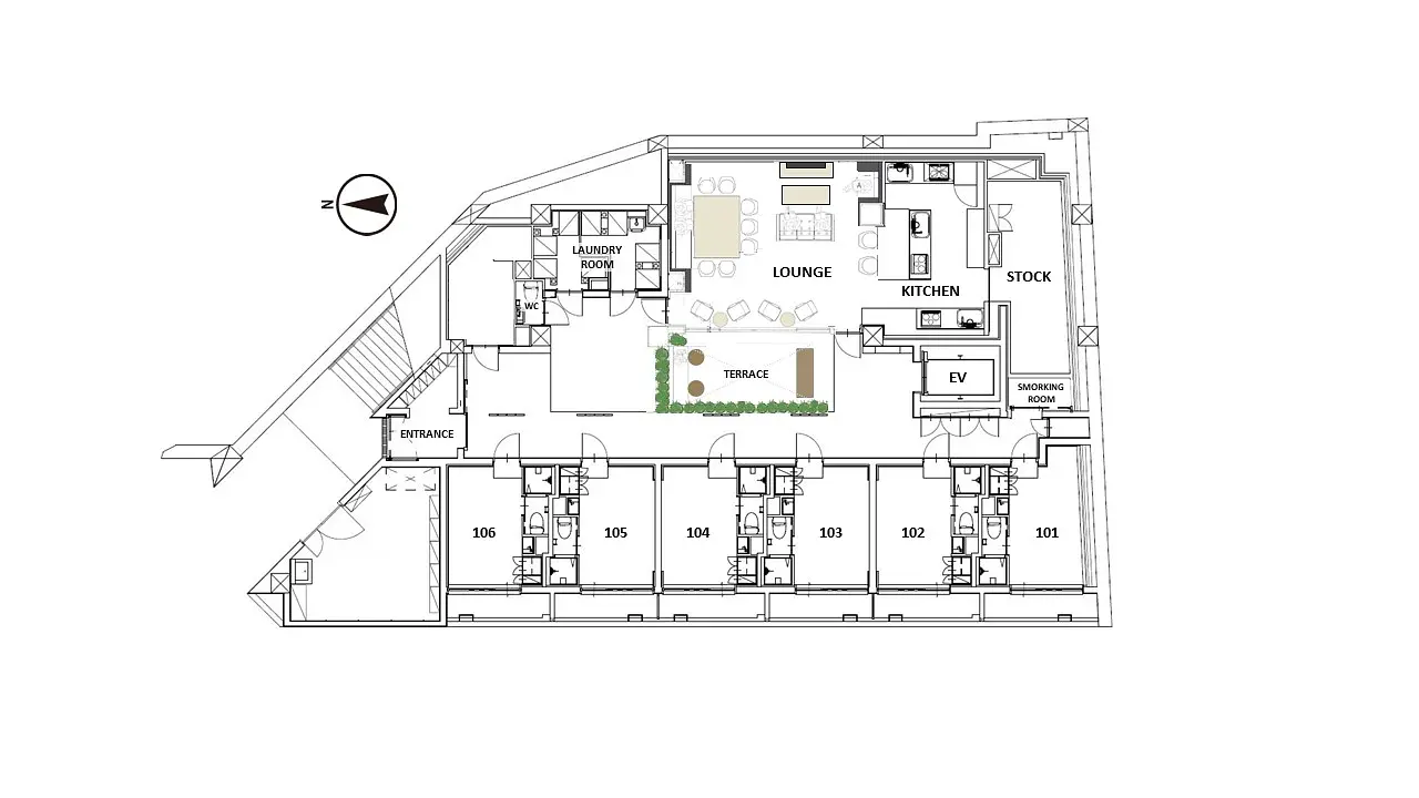 The property is equipped with the latest amenities, characteristic of a new building. Residents can enjoy a luxurious lounge, a 24-hour shared kitchen, and a terrace, providing comfortable communal spaces. Additionally, each unit comes with its own toilet and shower, ensuring privacy for all.