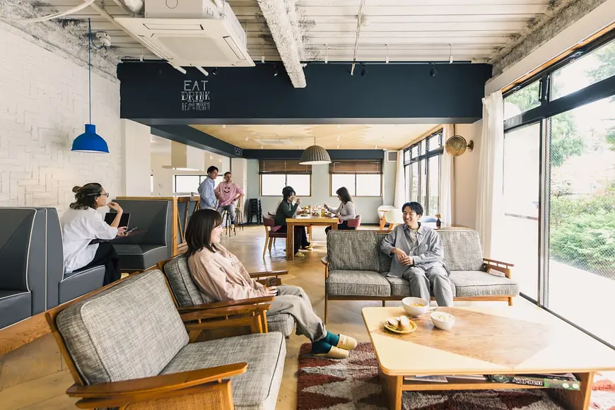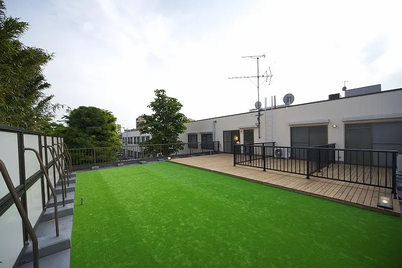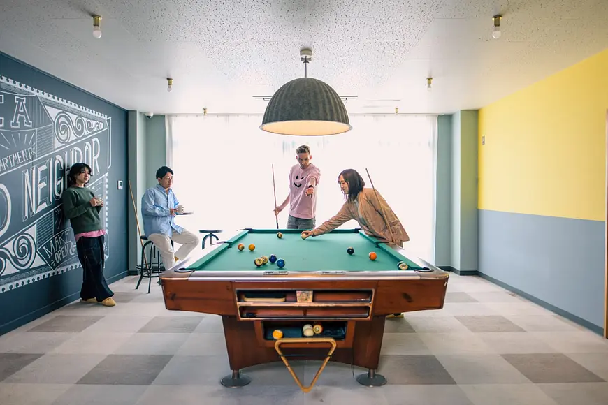 Social Apartment Oizumigakuen has a 90㎡ lounge, kitchen, and garden, with a variety of common areas where you can enjoy billiards, BBQ, and sunbathing. A working lounge is also available, making it easy to switch between work and private life.