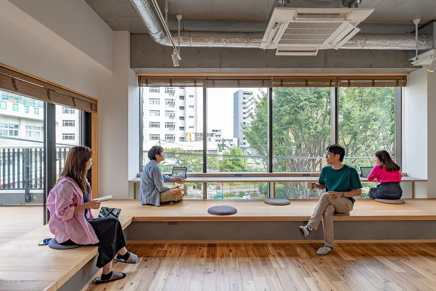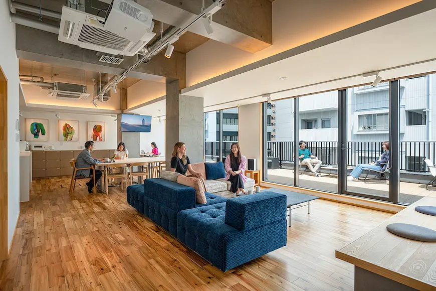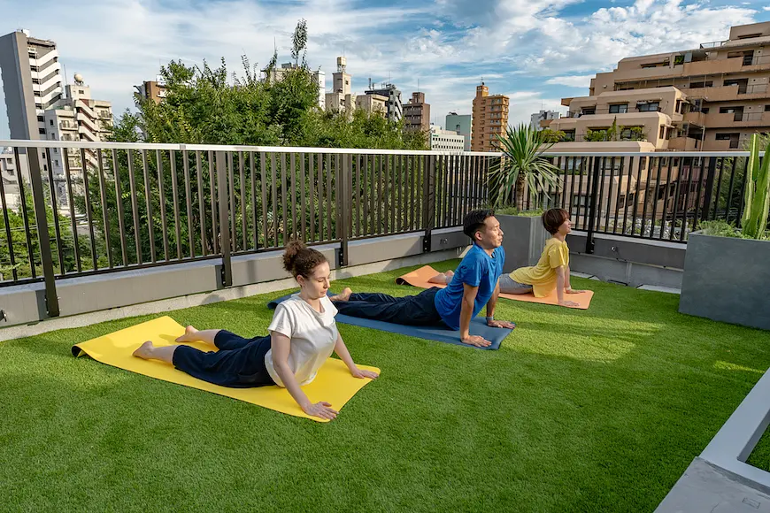 Outside the lounge, there's a 30-square-meter wood-decked terrace with cozy sofa and desk seating surrounded by greenery, offering a relaxing escape. You can also work remotely here using the available Wi-Fi. For those seeking more space, a rooftop area with artificial grass is accessible via an outdoor staircase, complete with facilities for yoga and stretching.