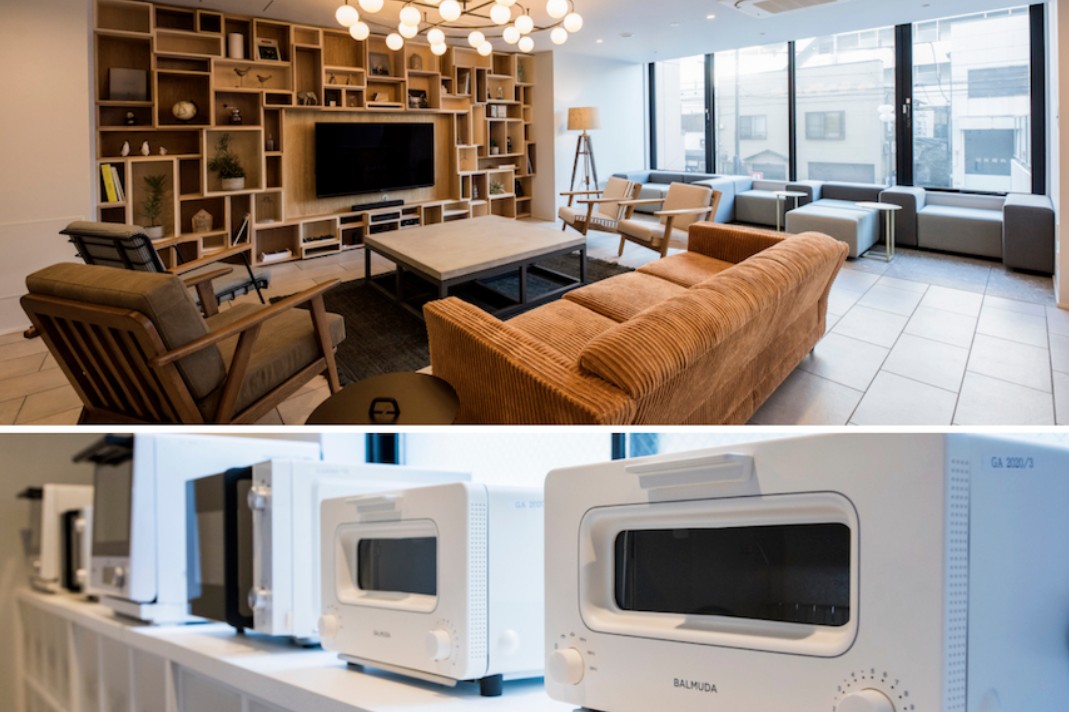 ▲This is the lounge at Neighbors Higashi-Jujo. The kitchen at Neighbors Higashi-Jujo. A BALMUDA toaster and Panasonic “Bistro” microwave oven are lined up in the kitchen.