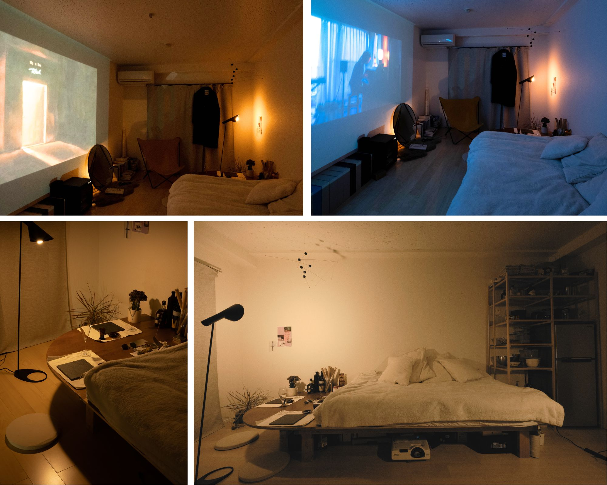 Y set out to create a space that feels light and breezy—and it totally works. The right side of the room serves as the cozy living zone, while the left is kept clear with only low-height pieces to make way for a projector setup. When the screen lights up, the entire room transforms into an immersive theater-like experience.