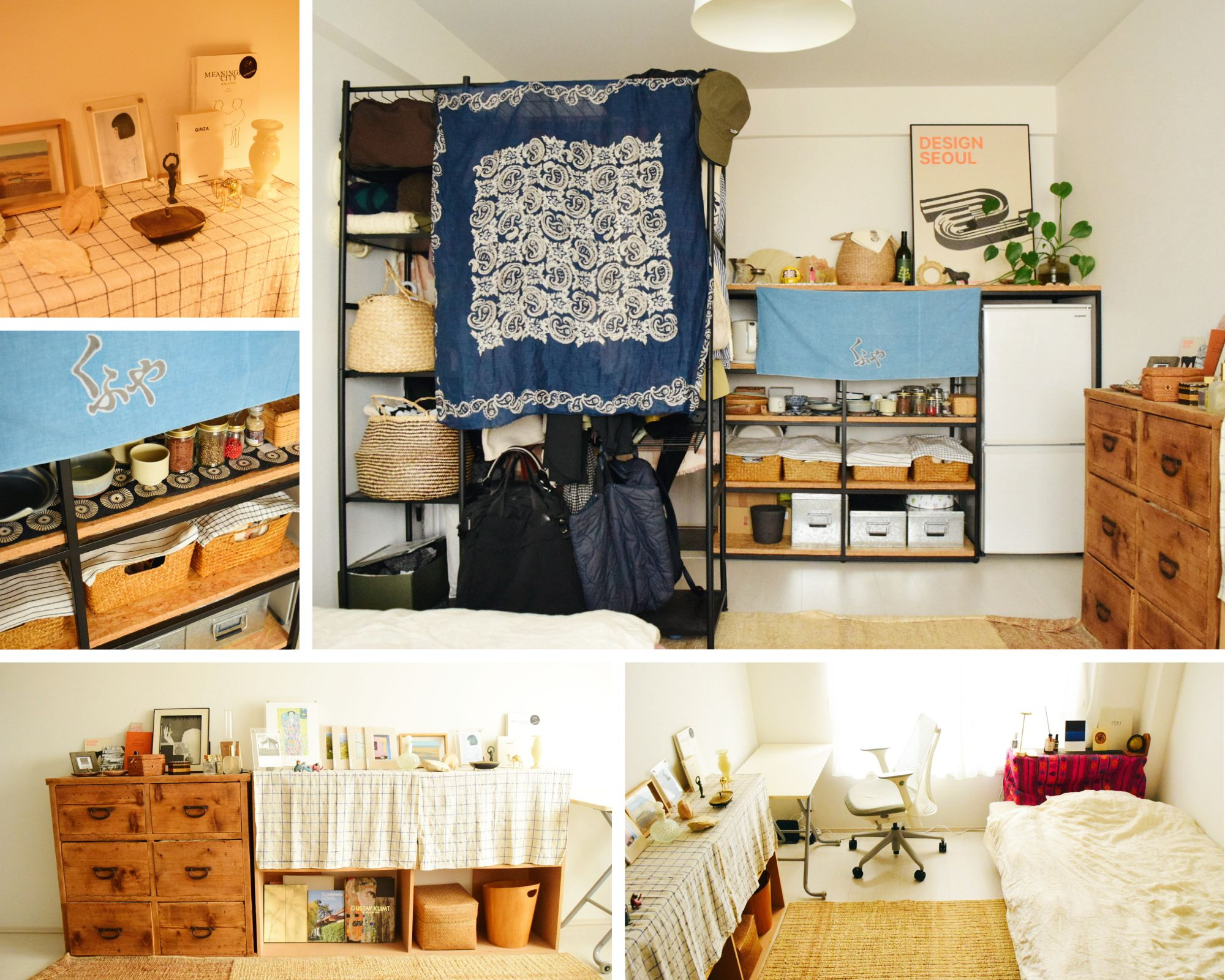 This charming space is full of things that bring joy—handmade shelves, beloved plates from across Japan, and souvenirs from past travels. H has created a room that’s both personal and peaceful.