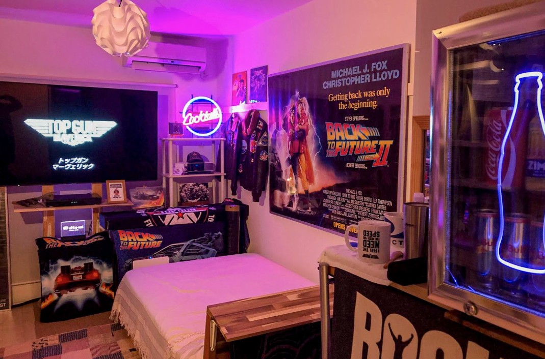 Lit up with bold purples, blues, and neon lights, this room is packed from wall to wall with memorabilia—from Top Gun to Mission: Impossible—featuring autographs, rare collectibles, and nostalgic gems that any fan would love. It’s a true shrine to 80s pop culture.