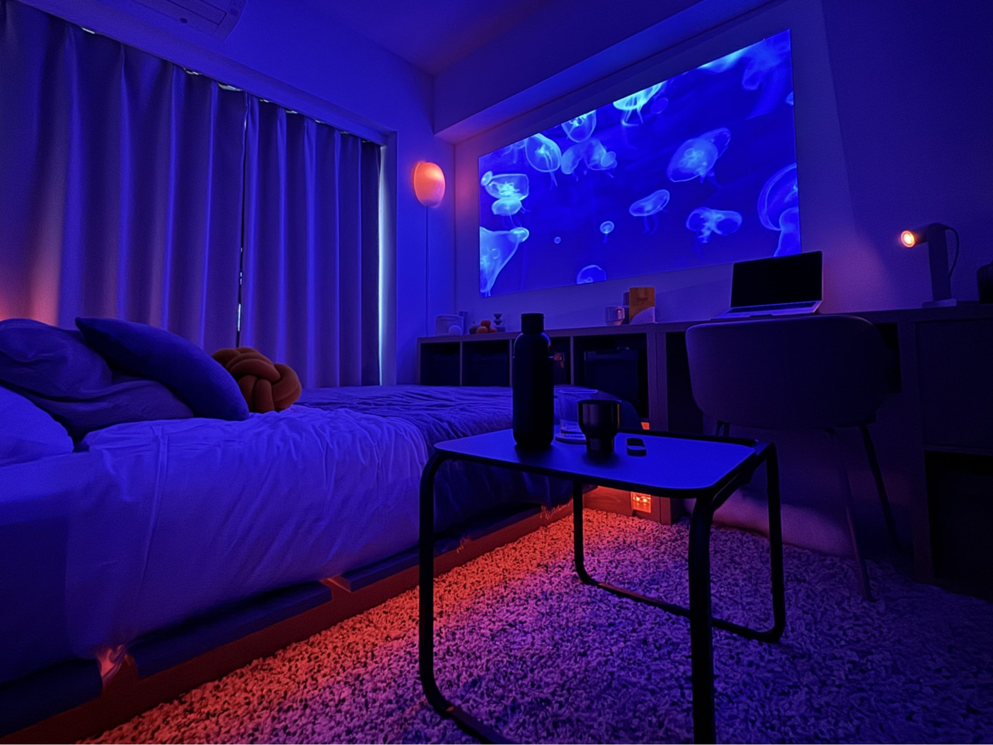 What’s really cool? The room shifts with the time of day. In the daylight, it’s a bright and productive workspace. At night, it becomes a cozy cinema, thanks to a projector setup. And the lighting? Total game changer. Whether it’s soft blue for relaxing or a cyberpunk glow for fun, the room transforms at the push of a button.