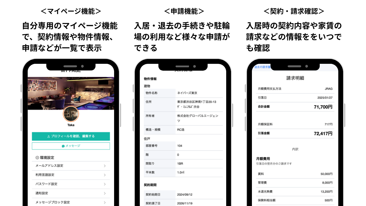 - サポート機能:入退去の契約手続きや管理会社からのお知らせ、各種申請など入居中の手続きや申請ができる「My Page」を搭載