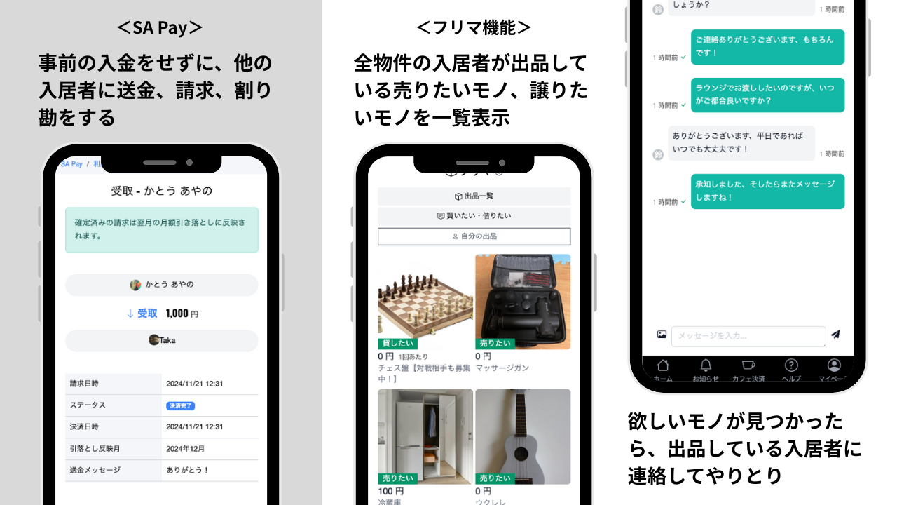- 決済機能:入金不要で割り勘や送金が簡単にできる「SA PAY」や入居者間で物品のやり取りができる「フリマ」を搭載