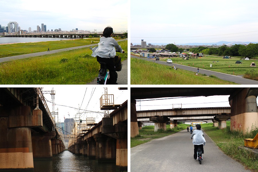It was a cloudy day, but there were people enjoying day camping and the atmosphere was perfect for a picnic. Riding a bicycle along the riverbank, the noise from the cars becomes distant, and the wind and the sky seem closer.