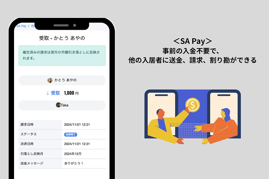 旅行やみんなでの食事など、ソーシャルアパートメントでの生活では割り勘をする機会も多くあります。そんな入居者同士の金銭のやりとりを簡単にできるシステムが「SA Pay(エスエー・ペイ)」です。クレジットカードの登録やチャージなどの手続きは不要。「SA Pay」で決済された金額は、決済月の翌月の賃料引落しと併せて精算されます。