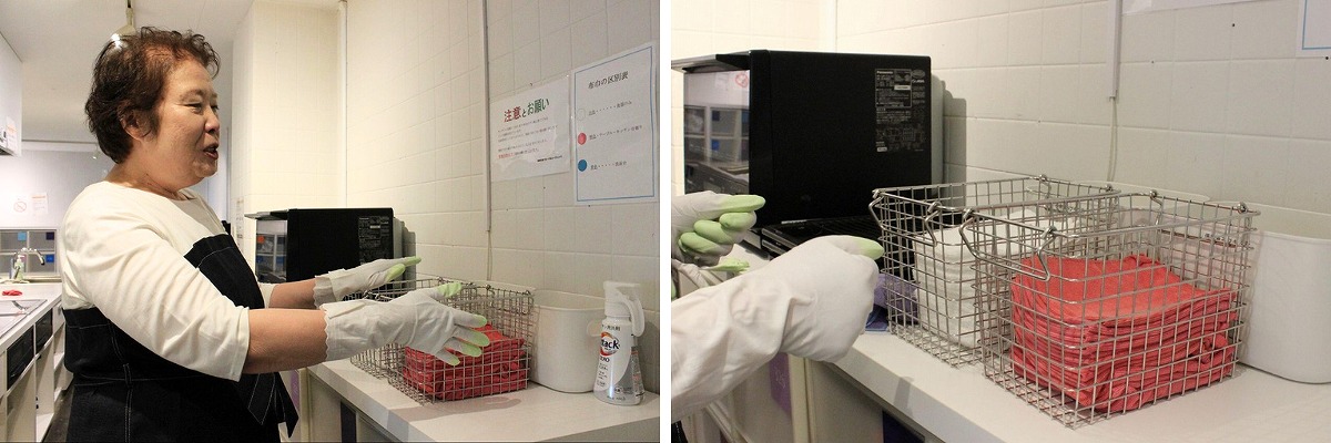 ちなみに、入居者さんが利用する食器用と台拭き用の布巾も分かりやすく2種類に別れています。見栄えが悪いのと、洗濯した時に劣化が早いのでタグもしっかり切っているんですよね。