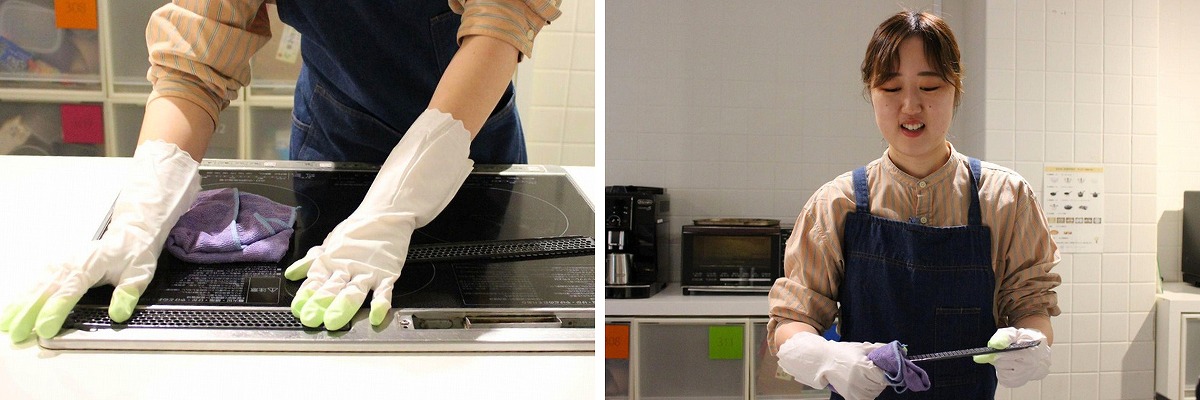 私たちの日常清掃として、クレンザーでしっかりと汚れを落とし、最後は乾拭きで仕上げます。IHと調理台の境目の溝も、クロスを差し込むようにして拭いています。