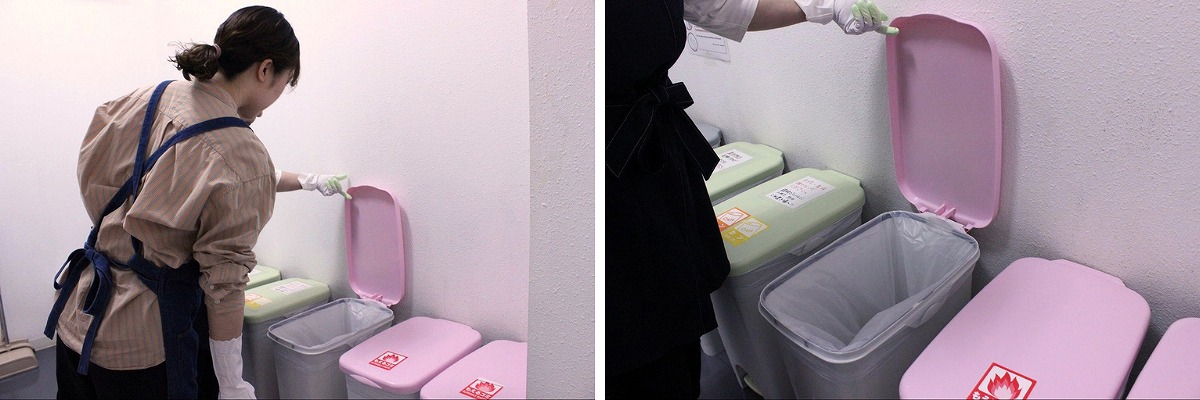 キッチン用はブルー、トイレ用はピンク、その他はイエローと、など、色分けすることでうっかり間違い防止と、入居者さんに衛生面を配慮していることを安心してもらうために工夫しています。