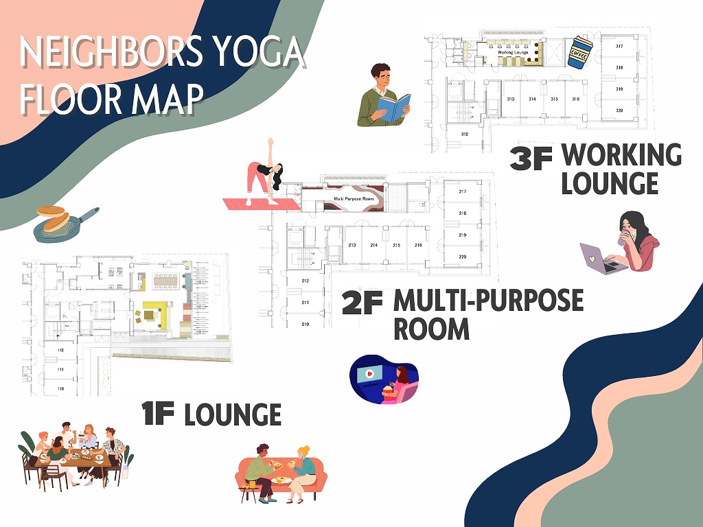 Neighbors Yoga has a three-story structure with a lounge on the first floor, a multi-purpose room on the second floor, and a working lounge on the third floor. The space is designed to allow for different use of "input" and "output" depending on the situation.