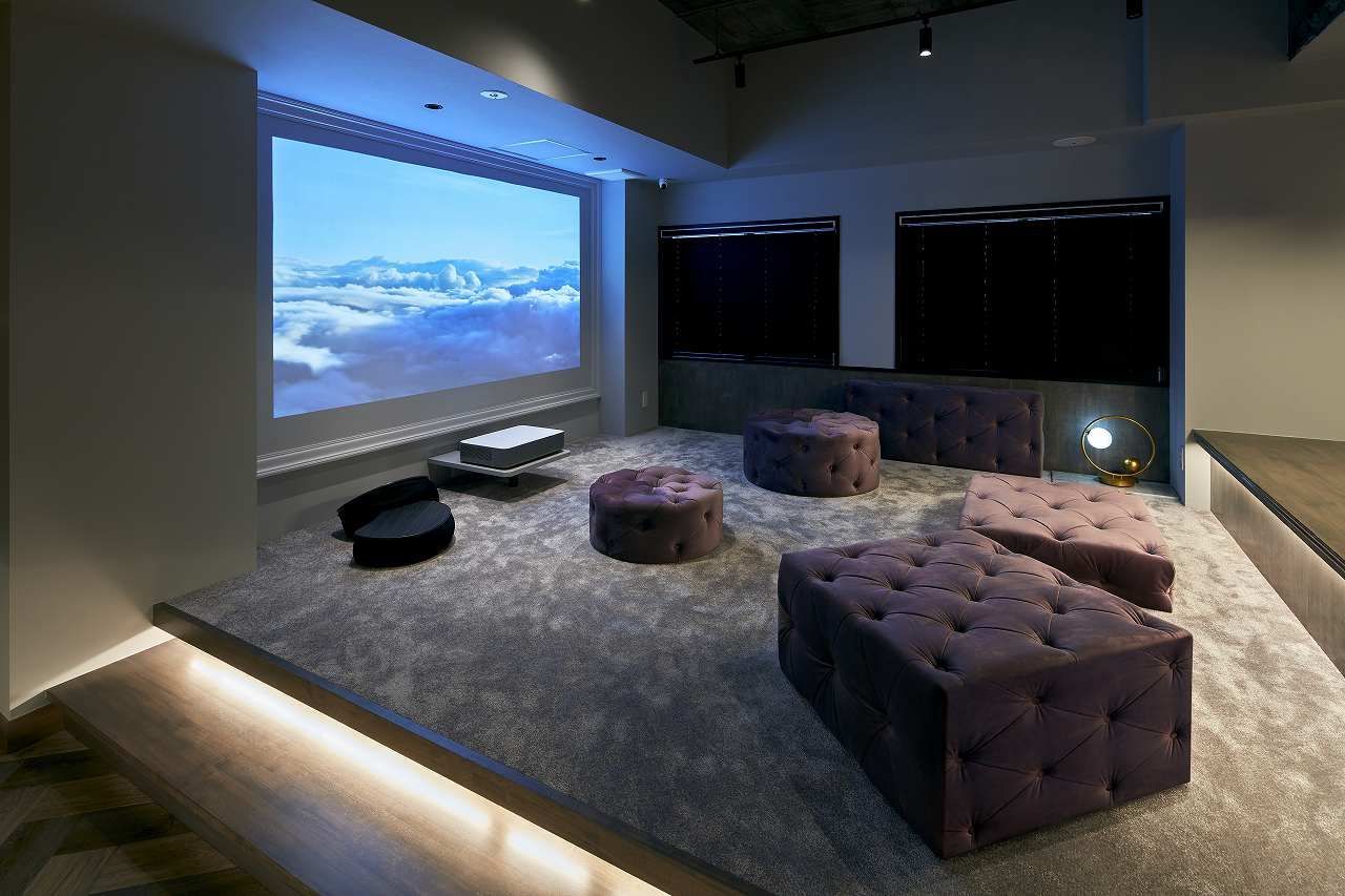 夜になると照明の明るさが抑えられるので、単焦点プロジェクターに映像を映してシアタールームとしても活用出来ます。昼から夜へと、時間の流れとともに用途が変化していくワーキングラウンジとなりました。