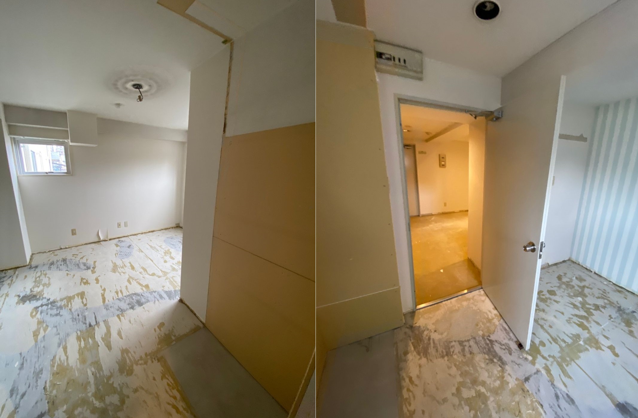 工事中のラウンジ入り口付近。実は元々壁が無く、エントランスから丸見えの状態でした。
