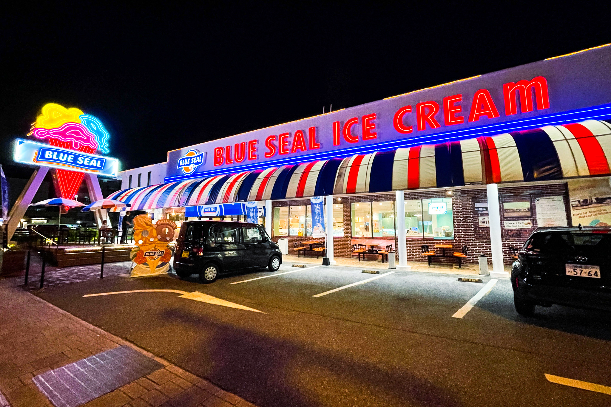 帰りがけに沖縄ローカルアイスクリームショップ「BLUE SEAL」の本店である牧港店へ。どうしても夜に来たかった理由がこのネオン。沖縄とアメリカのカルチャーが融合したような雰囲気がたまらない。