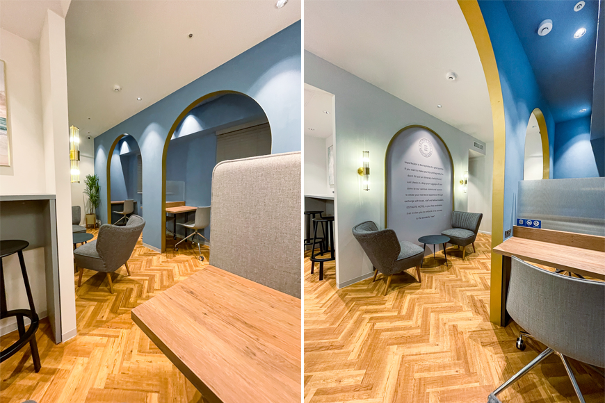 ホテルに戻ってきて、10Fワークラウンジでお仕事の続きを。集中して作業したい時は、仕事専用のスペースを使う方が捗ります。もちろん、電源・Wi-Fi完備、Web会議用の個室もあります。