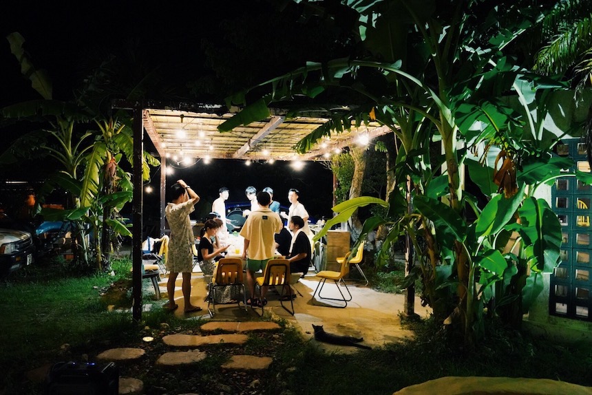 みんなで大自然の中にあるサウナ&BBQ施設「恩納村ゴーミー」へ。3台の車を用意し総勢14人で向かいました。あつあつのロウリュに入った後に、東シナ海に夕日が沈むのを眺めながら水風呂に入る贅沢さ…。大自然の中でキャンピングチェアで横になった時、ああ沖縄に来たんだな〜と実感です。