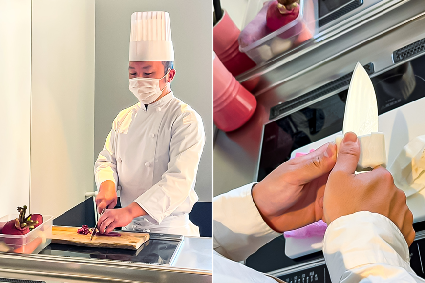 きんぴらチームでは、きんぴらにする野菜を切っていきますが、ここでもプロならではの工夫が。普段は捨ててしまうようなカブや大根の皮も、きんぴらやサラダの飾り付けに使っていくとのこと。