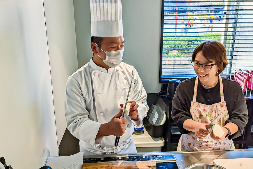 お互いの調理姿勢を確認し合いながら、最初は緊張されていた方もだんだんと打ち解けて行く様子も。中には、プロの料理人から直々に教えてもらったので「これからは料理が”出来る風”に見せられる!」と宣言される方も…。