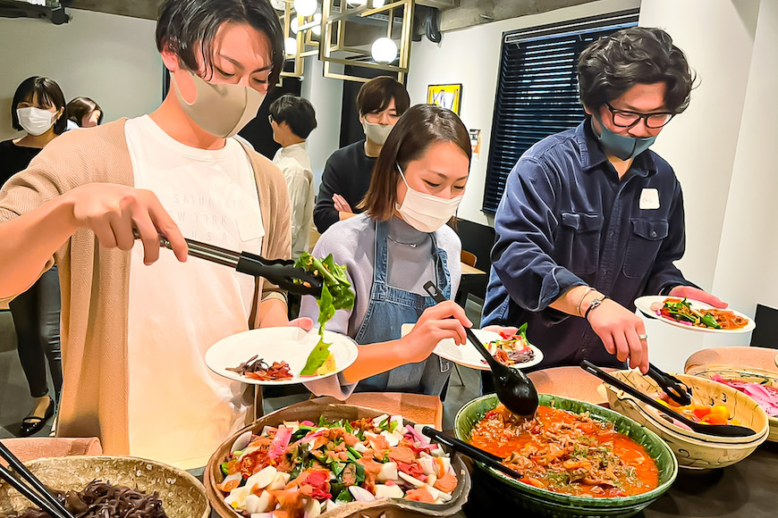 京おばんざい料理の特徴は何と言っても料理数の多さが魅力とのこと。参加者さんが作った「きんぴら」や「彩りサラダ」、MAPPY LABOさんに用意をいただいた本格的な「おばんざい料理」など全8品がカウンターに並んでいます。見た目も美しいたくさんの料理に食欲がそそられますね!ビュッフェ形式で盛り付けしていくので、オシャレに盛り付けをしている方もいました!
