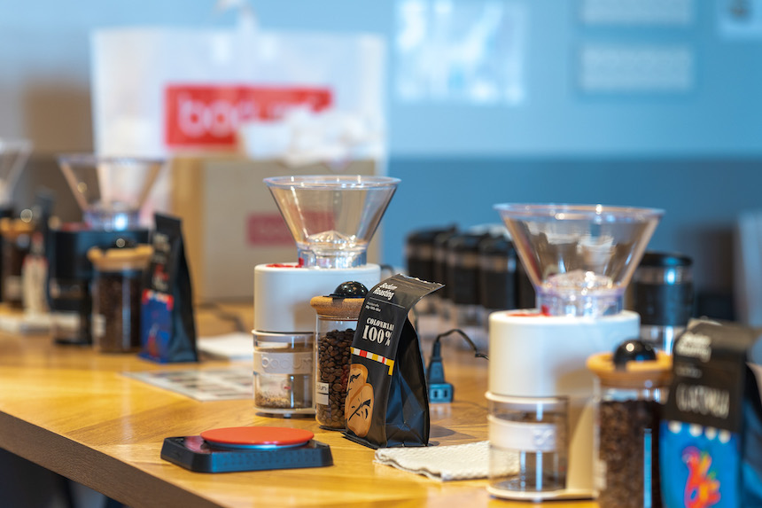 まずはBODUMオリジナルのコーヒー豆4種類の中から、自分の好みの味を探していきます。フルーティーなものから、しっかりとしたコクが感じられる深入りのものまで、コメントやアドバイスを聞きながら選んでいきます。