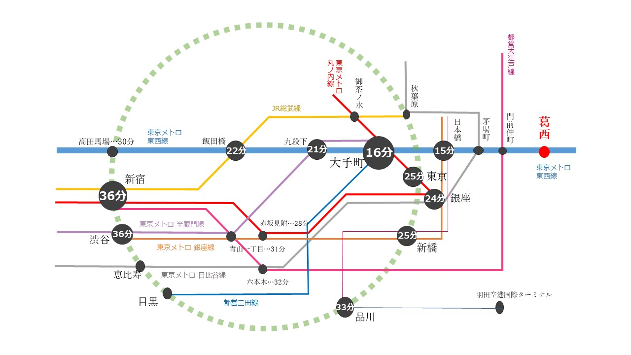 ネイバーズ葛西は東京メトロ東西線の葛西駅が最寄り駅。東西線は東京の一番のオフィス街である、「大手町」や「日本橋」まで15分程度で通うことのできる駅となっていて、都心部へのアクセスが良いのもポイント。