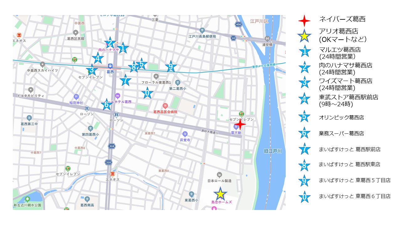 こちらの記事では、ネイバーズ葛西周辺の主要なお買い物スポットや商業施設をご紹介したいと思います。生活に密着したスポットが多いので、ネイバーズ葛西を検討する際の参考にしてみてください。