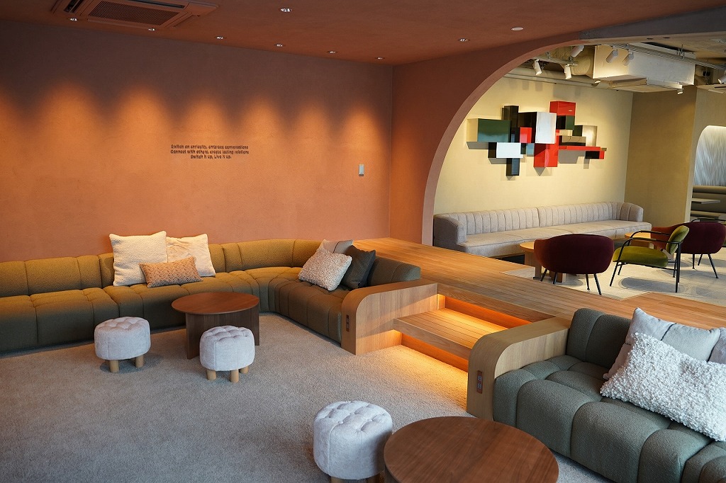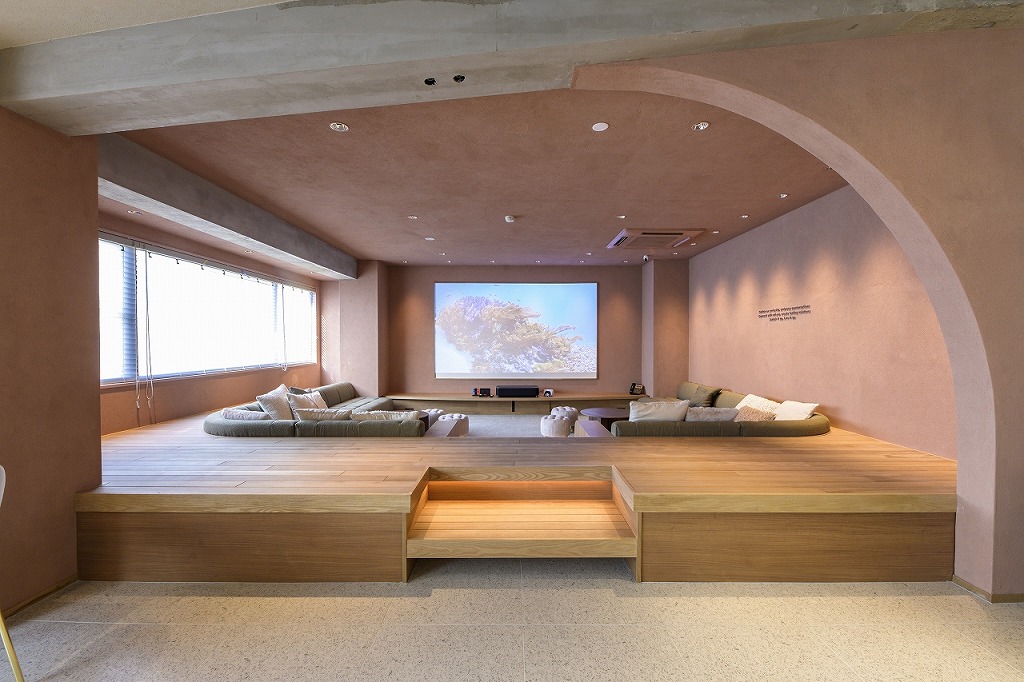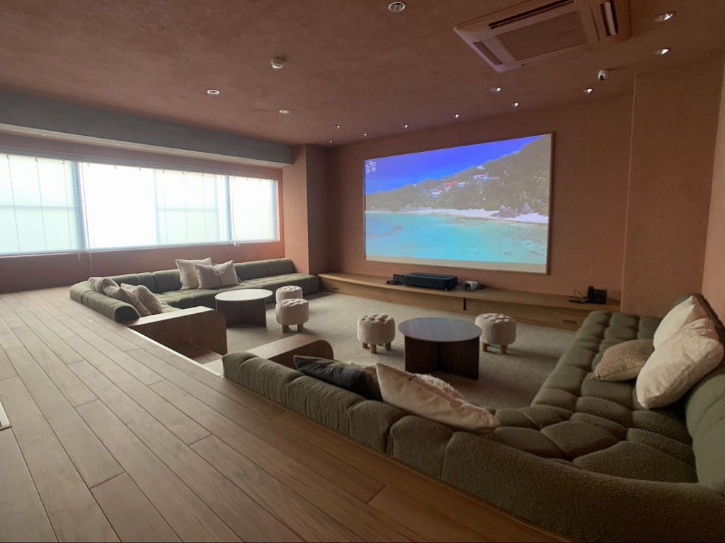 ルームシューズを脱いで感覚的にも開放的になれるソファエリアでは、プロジェクターで写す100インチ以上の大画面で映画やゲームを楽しめます。足を伸ばして、床に座ることもできるような毛足の長いカーペットに贅沢なソファ。「チル」という言葉がぴったりなリラックス空間です。
