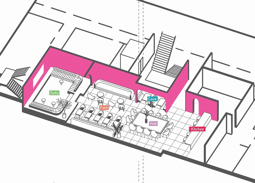 以前の食堂スペースは①広い給仕スペース②食事をとるスペース③仕切り壁の向こう側にレクリエイションスペースで構成されていましたが、壁が立ち上がっていることで細かく区分けされ広い空間であることが感じにくく、やや窮屈さを感じたため、その課題を解決する形で新たなラウンジとして生まれ変わっています。