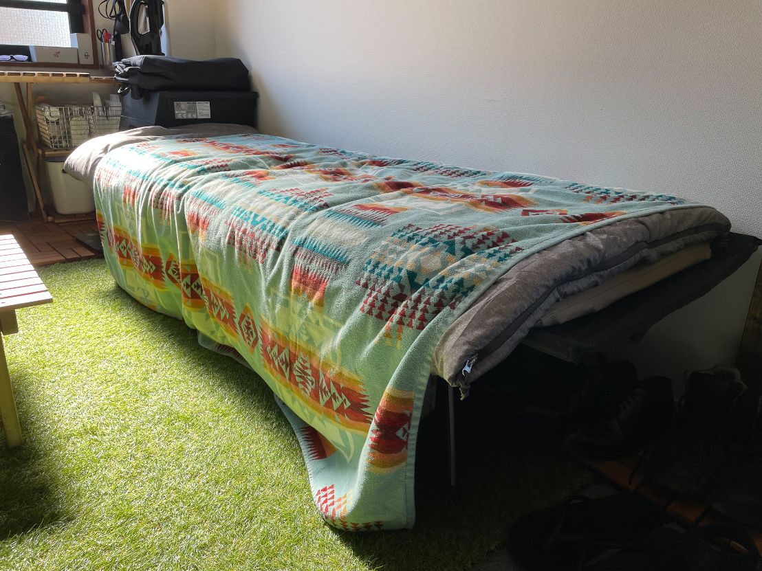 「ベッドはキャンプ用品で賄う」でしょうか。キャンプで使用するコットというアウトドア用のベッドを居室内でも使っています。いざという時は畳んで収納できるので部屋が広く使えますし、ベッドだけでなく他にも色んなものをキャンプ用品で代用しているのでキャンプに行くと部屋が空っぽになるんですよ(笑)