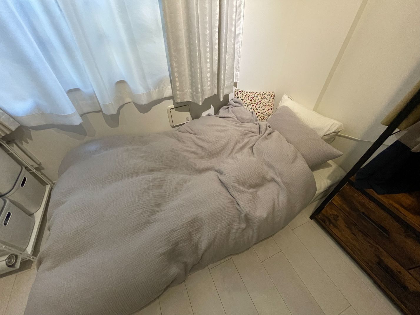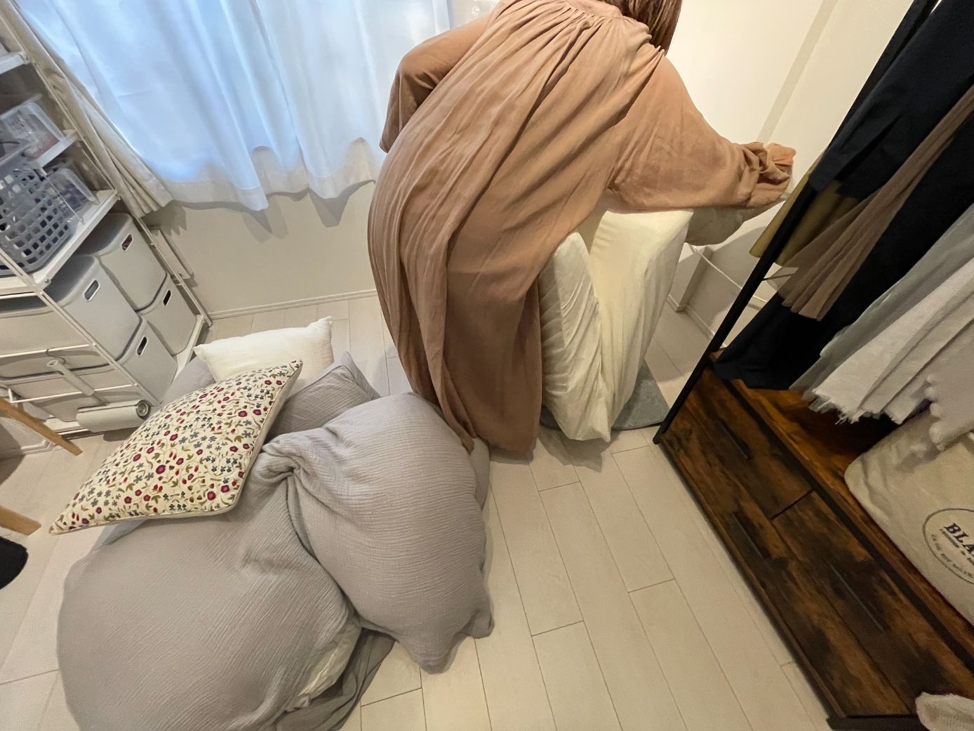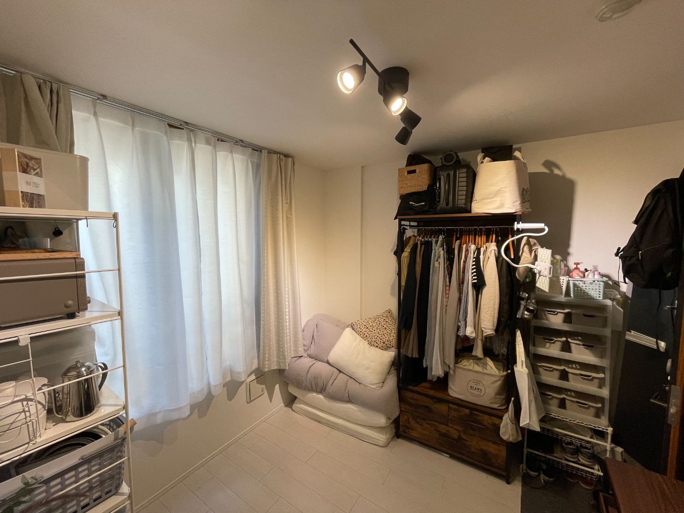 「コンパクトに、暮らしやすく」ですね。ベッドを置かないことでベッド下収納に頼らず、既存の収納だけで収まるような物量にしています。寝具はお布団にして、毎回畳んでいます。