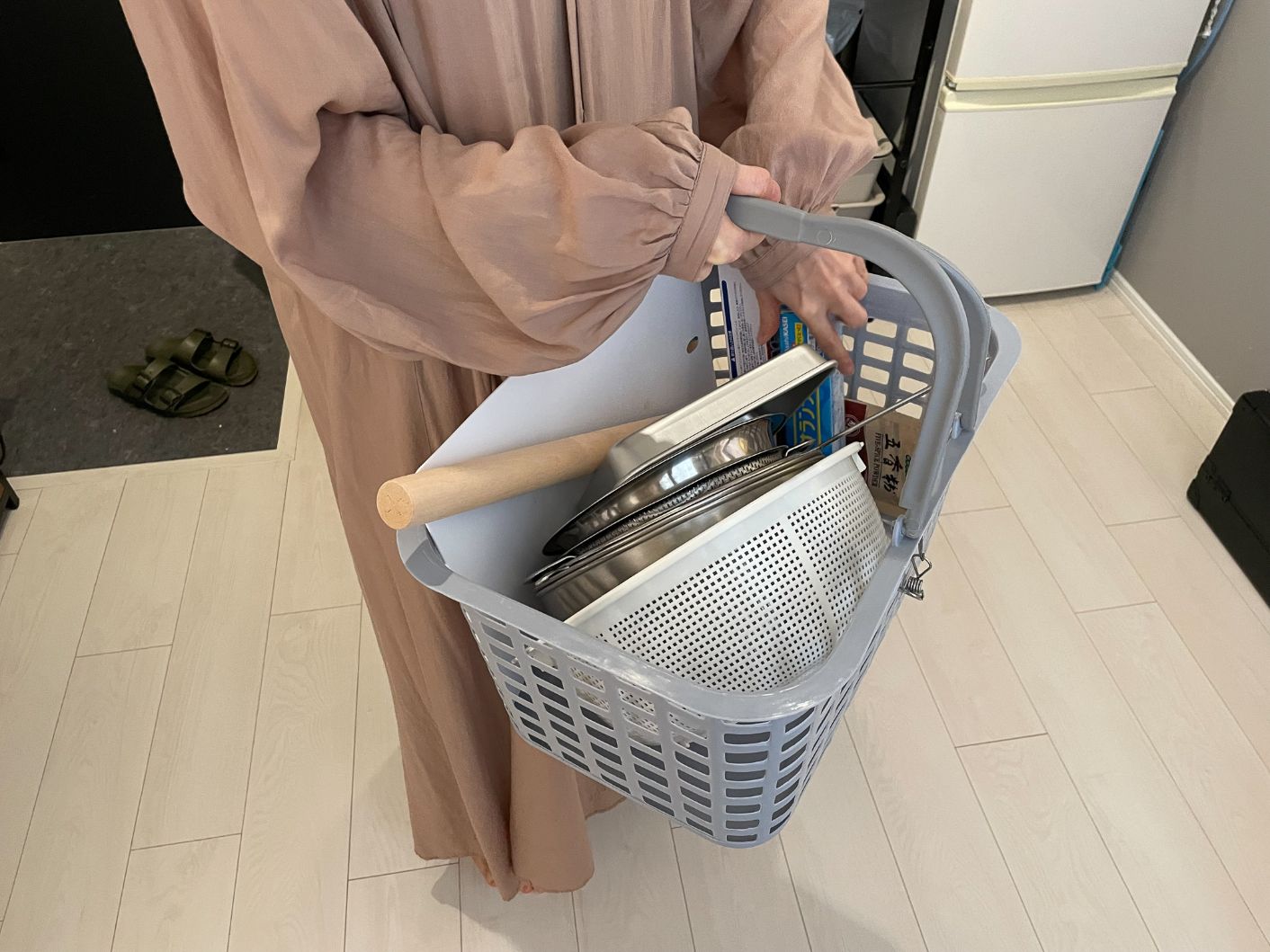 キッチンに道具を運ぶ用のバスケットですかね。自炊をよくするので自分の調理器具等はバスケットにまとめて持って行っています。共用部にあるものも利用しますが、お気に入りの食器を使うとテンションが上がるので、自室から持っていくことも多いです。