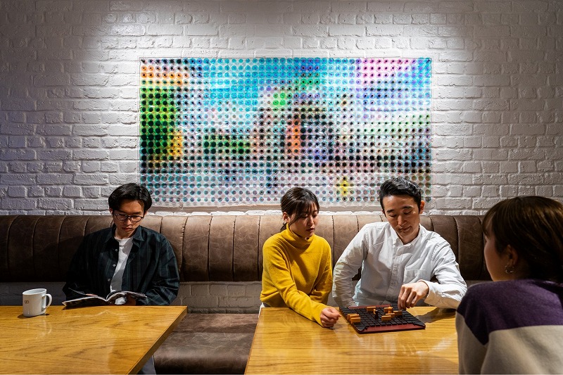 ▲(After)クッションフロアの奥にはソファ席を設置。靴が脱げるようになっていて、よりCHILLできる空間に。上のクッションフロアは飲食禁止ですが、こちらはOKなのでお菓子やお酒を持ち込んでゆったり交流なんてことも。壁面アートと同じ構図で写真を撮ったらインスタ映え…?