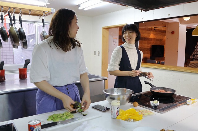 食材の調達も済んだところでみんなでクッキング。共用ラウンジのキッチンは、システムキッチンが5台入っていて広々とした空間で料理ができるので、一緒にごはんを作ることも楽しめます。