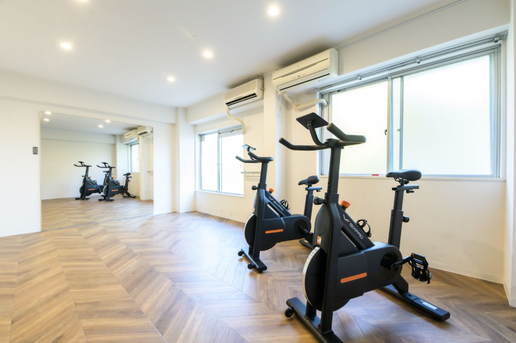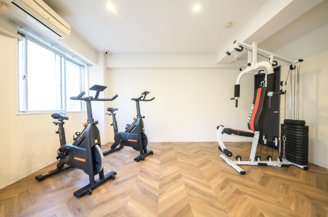 約22㎡の空間は、鏡張りのエリアにブルーのビニール製床材、フィットネス器具エリアにはグレーカーペットが敷かれ、2つに分かれているため視覚的にコンパクトな印象を与えていました。