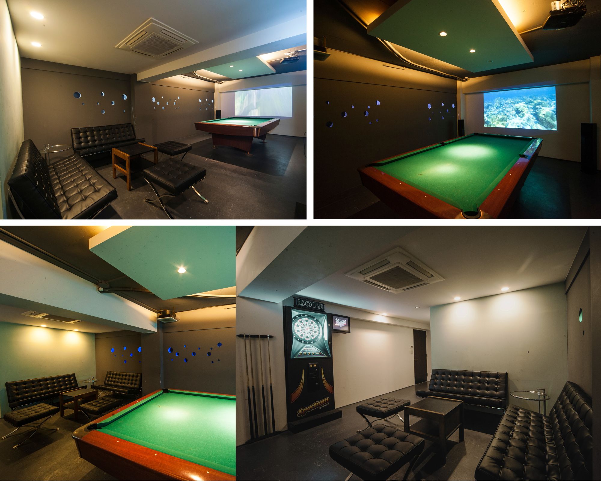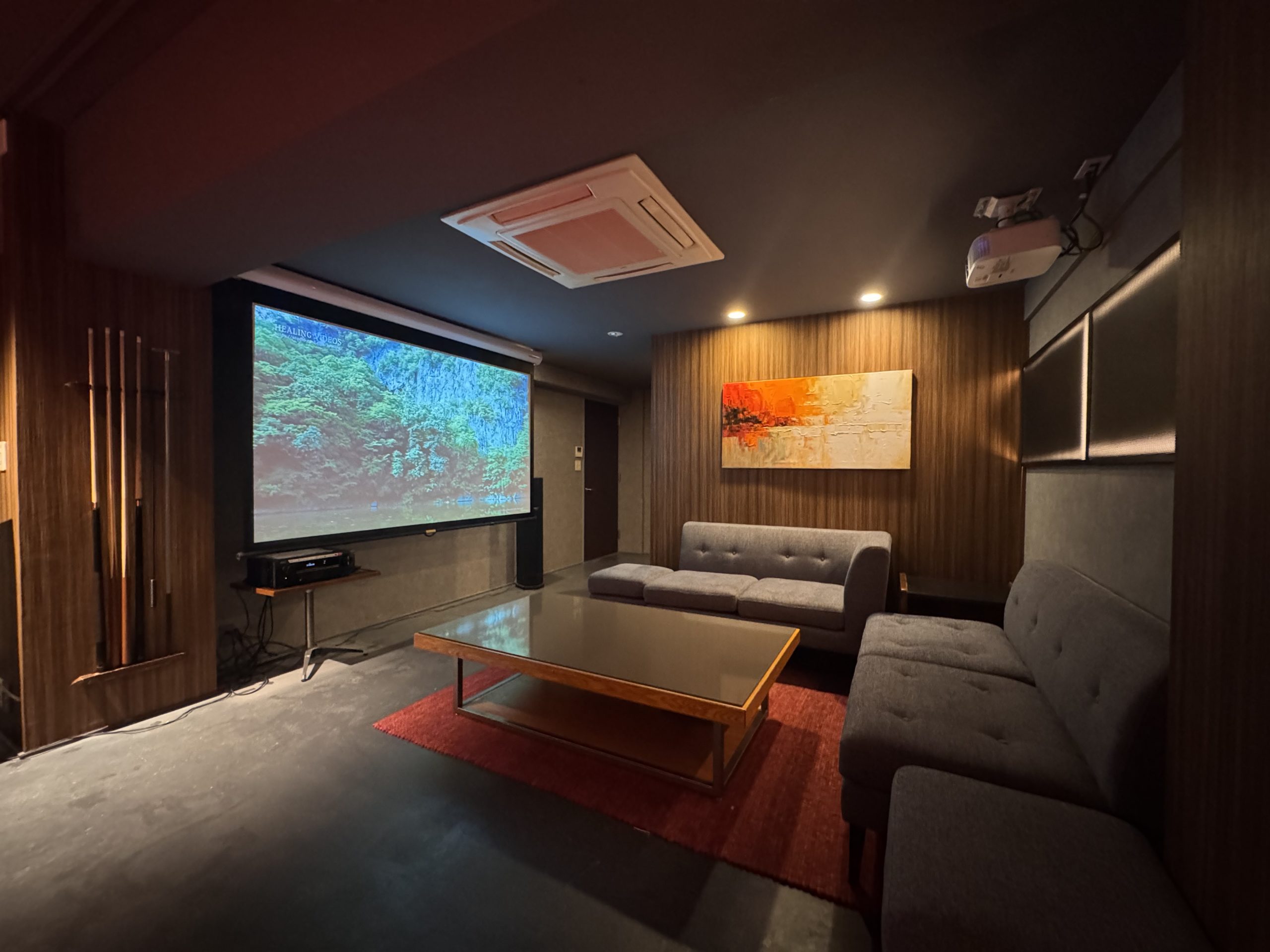 入口近くのソファーエリアはシアタースペースとしてアップグレードされ、ダーツボードは撤去。既存のプロジェクターは撤去し、新たに高精細な4K相当の高画質プロジェクターを導入。Android TV™を活用し、動画配信サービスを視聴できるようになりました。