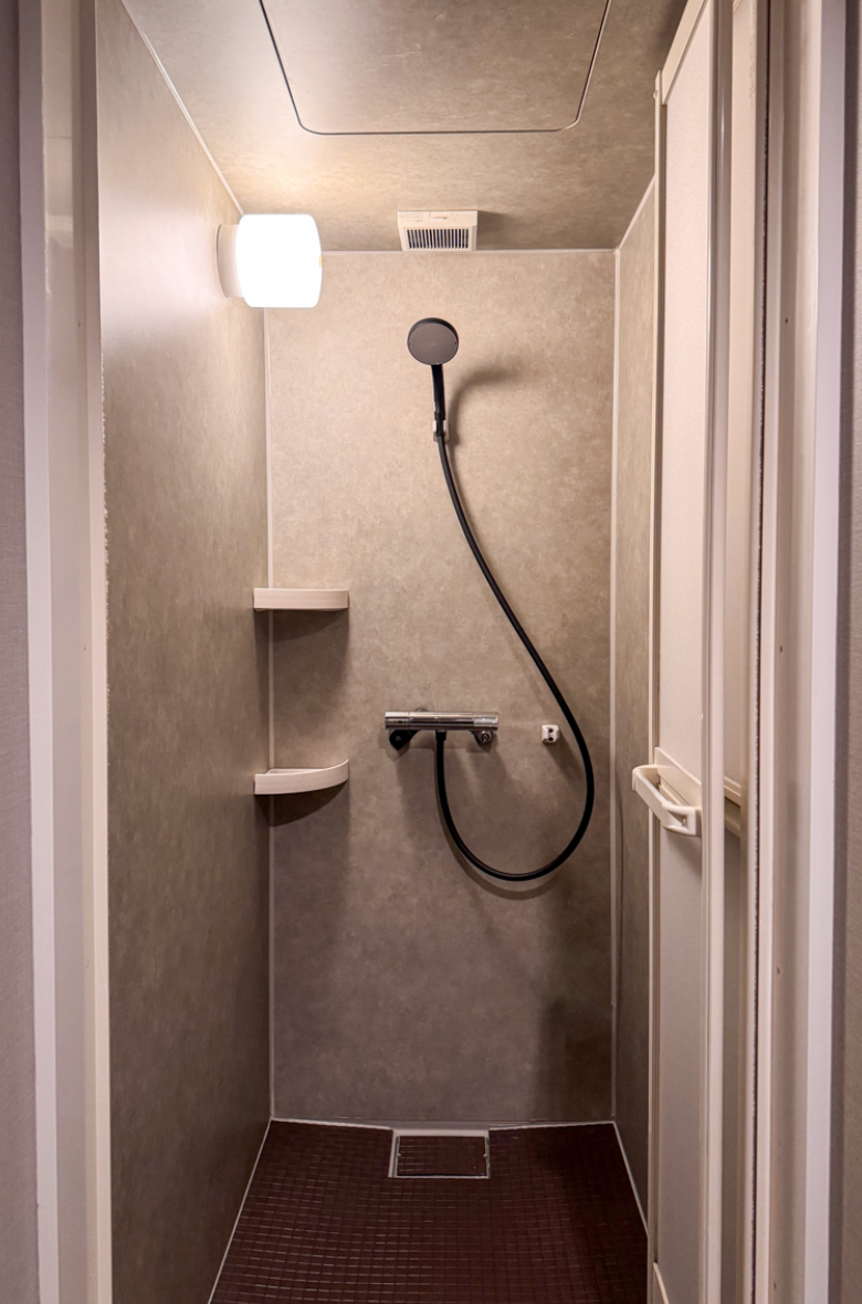 そのためシャワーユニット内と脱衣所をまるごとアップデート。シャワーユニットは床シートや天井をグレー系素材に張り替え、シャワーヘッドは最新のサーモタイプに変更。汚れを目立ちにくくすることで、清潔感と実用性を兼ね備えました。