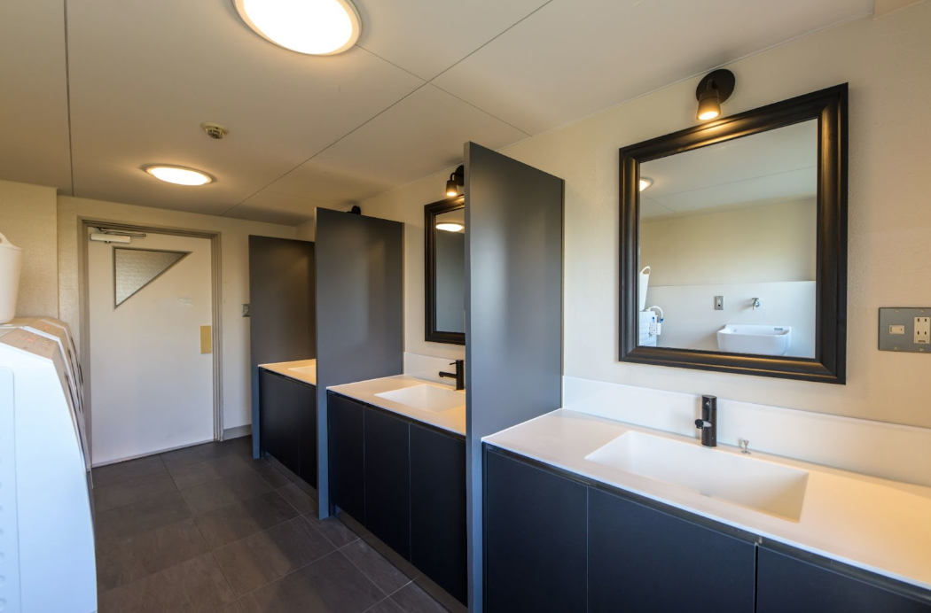 各洗面台をパーテーションで区切り、一人ひとりが自分の空間に集中して身支度を整えられる設計に変更。特に女性にとっては、朝の洗顔やメイクの際に人目を気にせず快適に準備ができるのではないでしょうか。