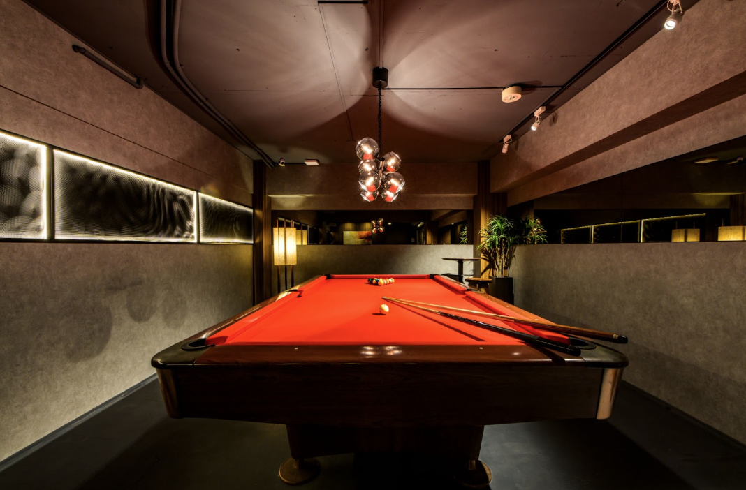 また、柱やソファエリアの壁面には木目調クロスへ張り替え、ビリヤード台の上部には象徴的なペンダントライトを設置し、さらにビリヤード台のクロスも、えんじ色に張り替えることで、どこか温もりを感じつつも「大人の秘密基地」のような空間を演出しています。
