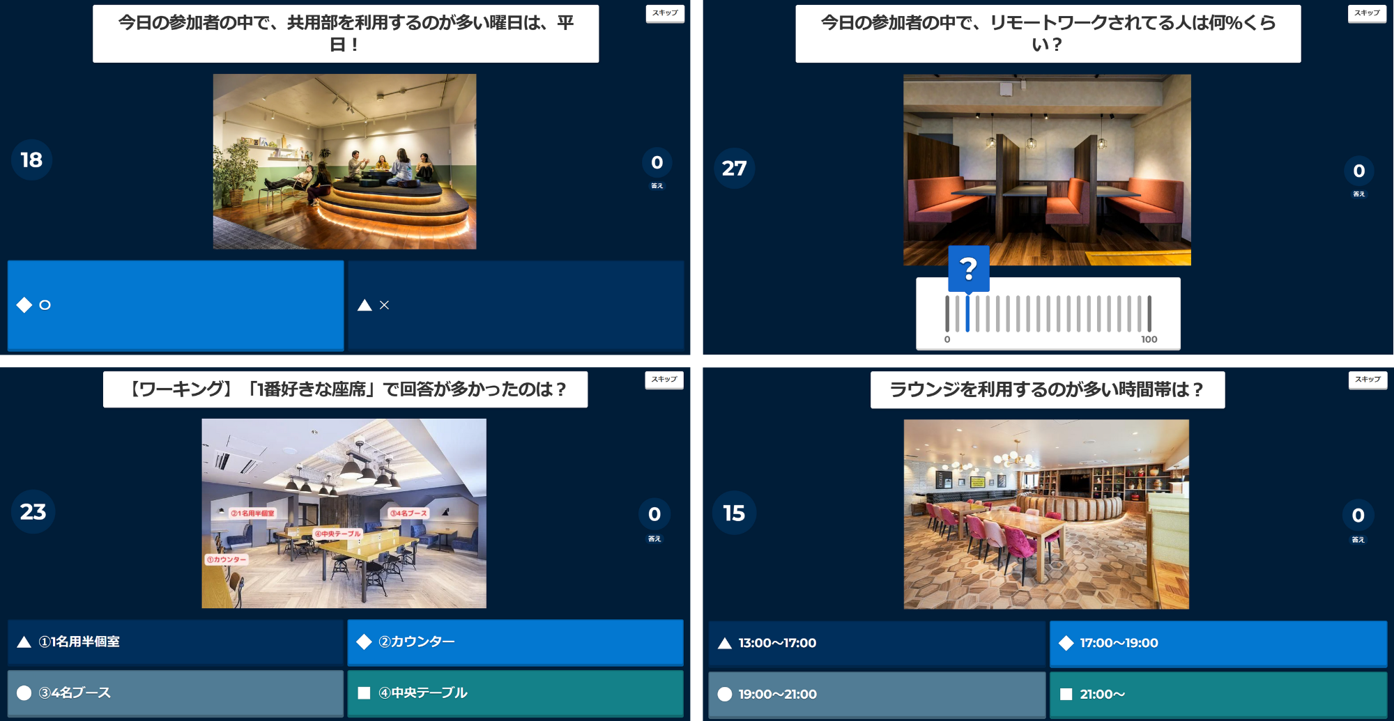 さて、そんな共用部を使う皆さんの「ペース」はどんなものなのだろうか?もちろん物件によって、またその時お住まいの入居者さんによっても変動するものではありますが、今回の参加者さんの「ペース」や嗜好を事前のアンケートで伺っていたので、こちらも出題してみました!どの曜日や時間帯だったら共用部で仲間に会えるか、どのエリアに人が集まりやすいか、などのヒントになったかな?