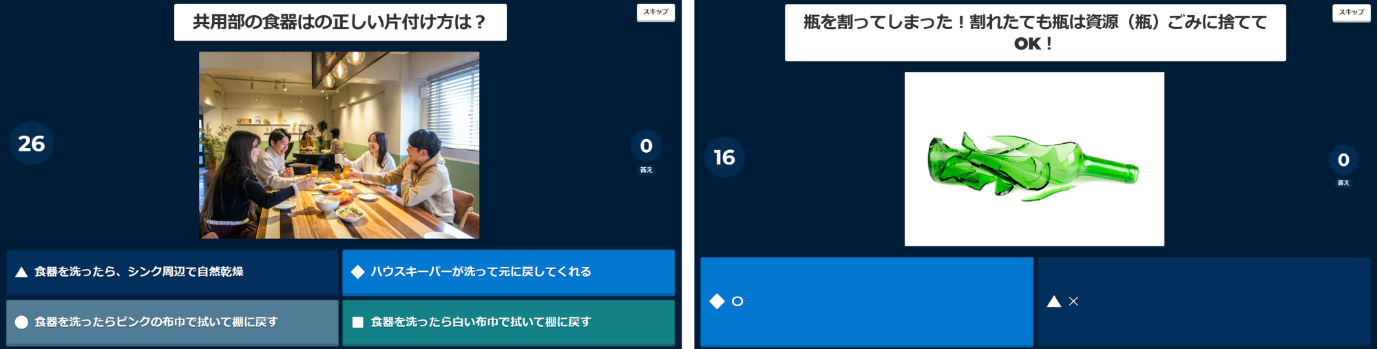 今回は、日頃から物件の清掃を担っている「ハウスキーパー」も参加してくれたので、時折起こる共用部の使い方やガイドラインの「間違い」や「勘違い」もクイズに盛り込んでみました。ハウスキーパーの熱い眼差しと期待を背負って、無事に全問正解する入居者さんに、ハウスキーパーもほっと一安心。