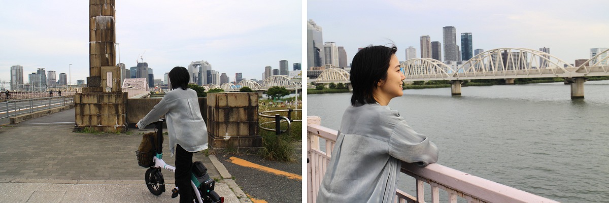 途中立ち寄った「十三小橋」は、鉄橋と淀川を一望できるスポット。曇天でもつい写真を撮りたくなるような景色に、城戸さんも思わず足を止めていました。