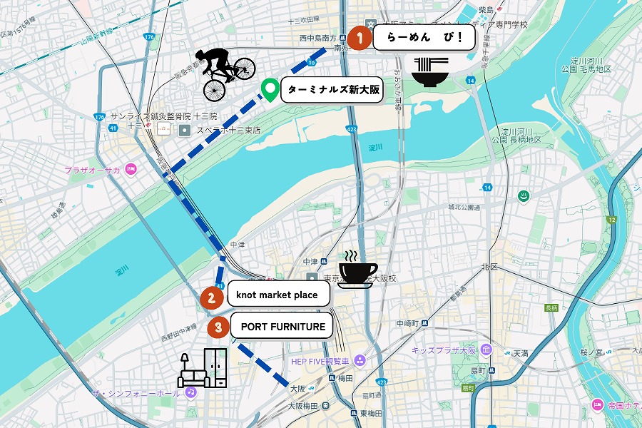 せっかくなので、休日に自転車を使ってターミナルズ新大阪のご近所をゆるっと巡ってみました。今回、取材に行ってくれたのはターミナルズ新大阪開発担当の城戸さん。西中島南方から梅田までのルートで城戸さんが気になる3つのスポットに立ち寄ってみました。